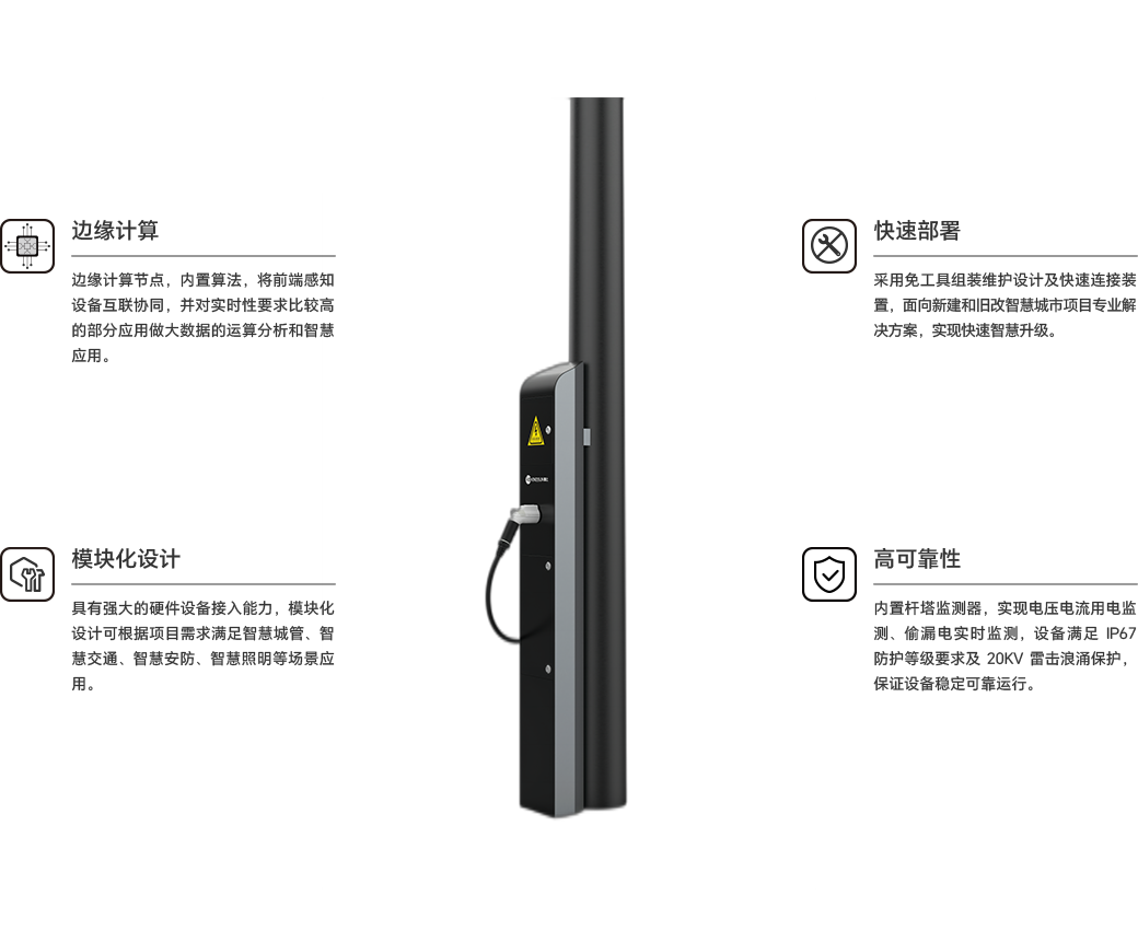 i·box智盒昰(shi)勤上針對智慧城(cheng)市(shi)舊改項(xiang)目(mu)推出的(de)帶邊緣運算能(néng)力(li)的(de)外置獨立智慧盒,其結構獨立,內(nei)置邊緣計(ji)算網關,傳(chuan)統燈杆通(tong)過(guo)外加(jia)智盒就可(kě)以(yi)快速(su)升級爲(wei)智慧燈杆,還可(kě)配(pei)置手機(jī)充電(dian)、汽車(che)充電(dian)樁、一(yi)鍵報警等(deng)智慧功能(néng)。适用(yong)于(yu)圓杆、方(fang)形杆、內(nei)滑槽杆、外滑槽杆安(an)裝(zhuang)等(deng)類型路燈杆。
